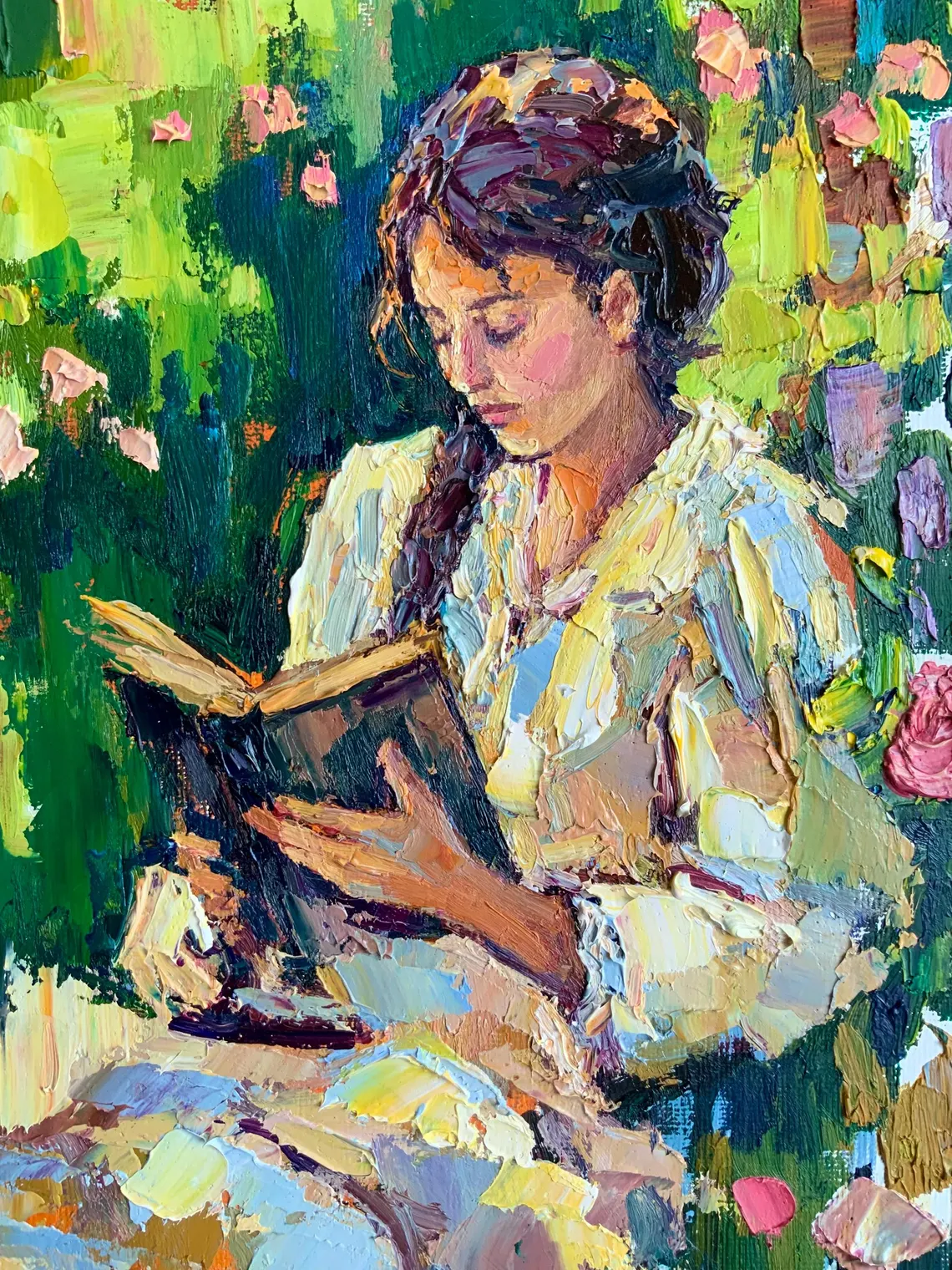 This oil painting is created in a vivid impressionist manner with expressive, textured palette-knife strokes. It depicts a young woman deeply absorbed in reading a book.