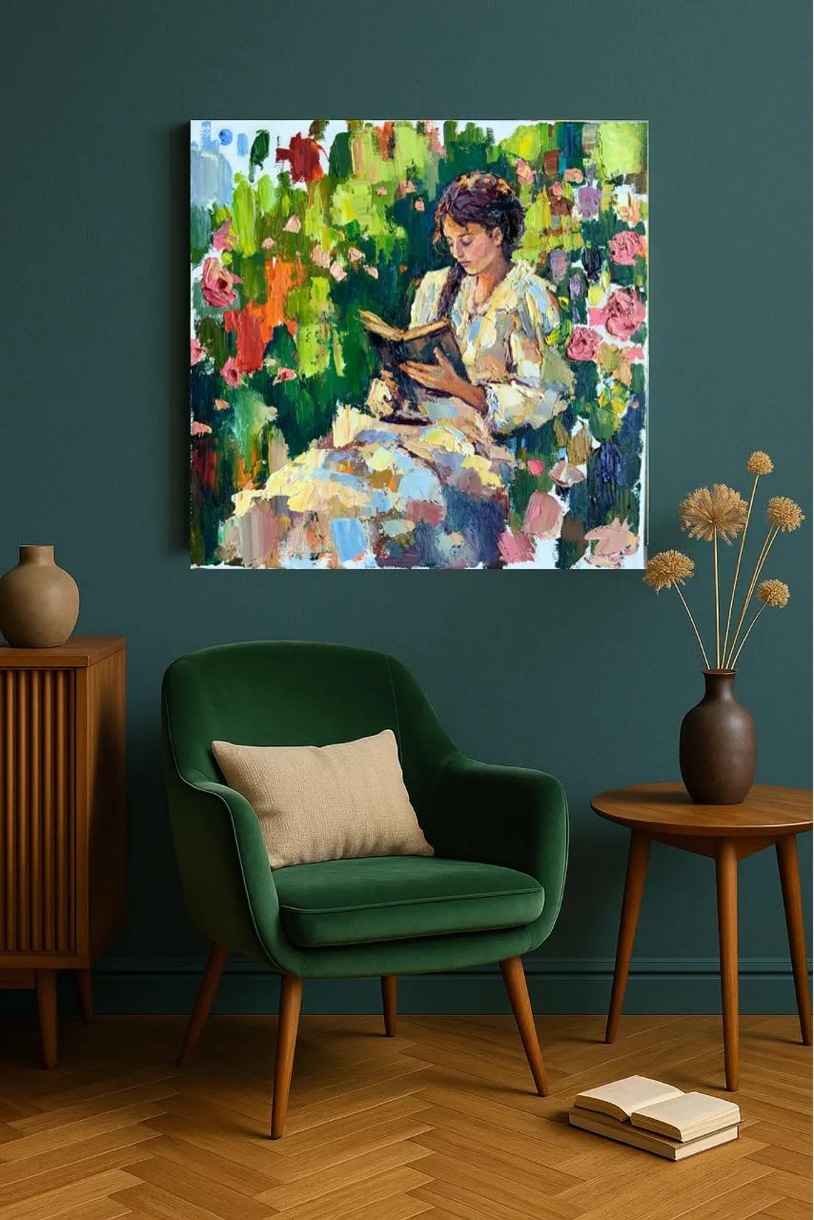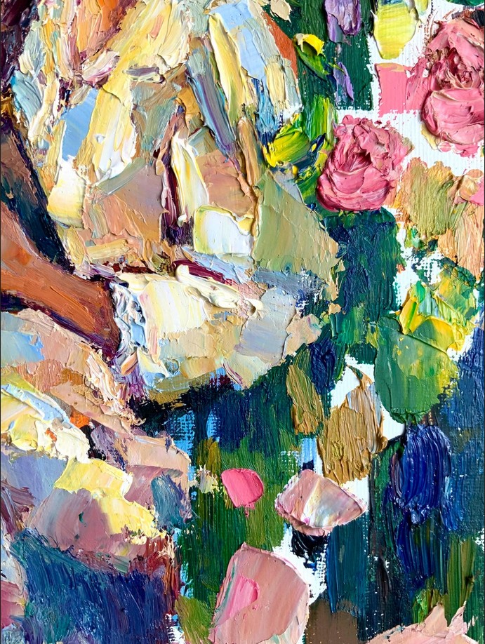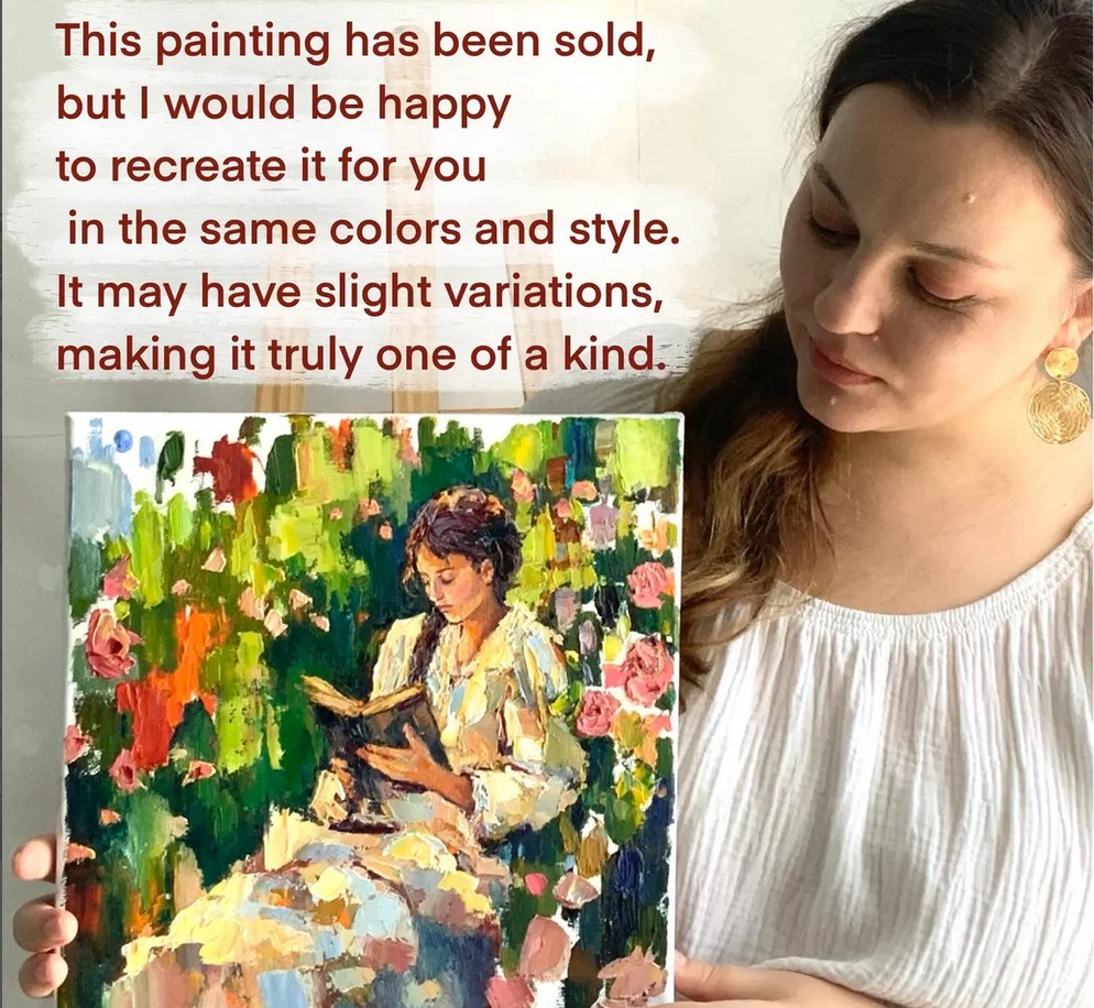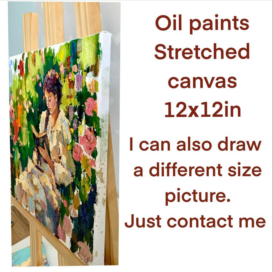 The painting radiates harmony and a romantic mood—it invites the viewer to pause for a moment, breathe in the fragrance of roses, and immerse themselves in the world of the book along with the heroine.
