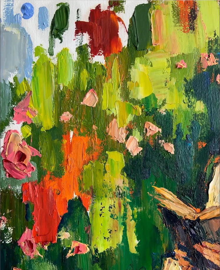 The background is painted with broad strokes that suggest movement and life in the garden, yet it does not distract from the central figure.